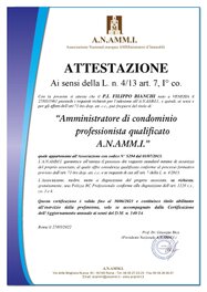 La normativa del condominio, richiede, obbligatoriamente, all'amministratore "un corso di formazione iniziale e attività di formazione periodica in materia di amministrazione condominiale" (art. 71 bis disp. att. cc.). L'A.N.AMM.I., iscritta all'Elenco delle Associazioni rappresentative a livello nazionale presso il Ministero della Giustizia (D.lgs n. 206/07) svolge corsi e aggiornamento professionale per amministratori di condominio, con rilascio di idonea certificazione.